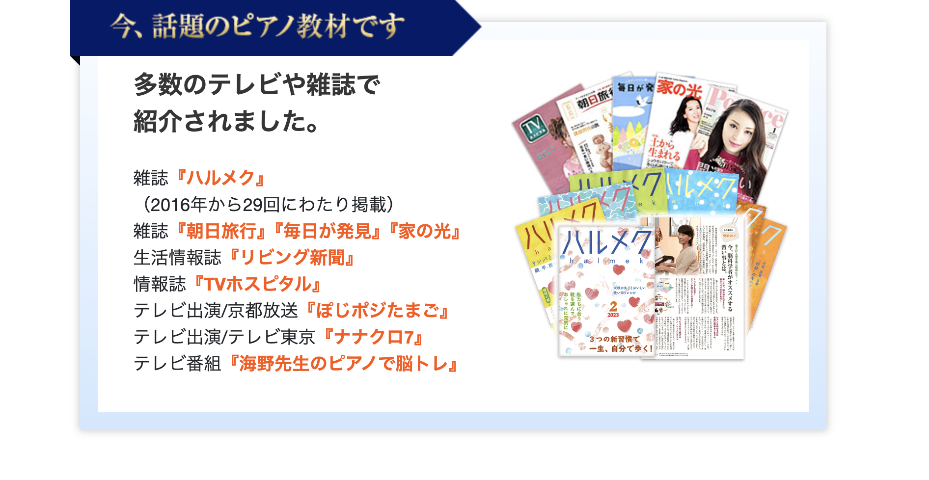 主に幼児〜大人の初心者から中級者向けを想定していますが、教材によっては年長児向けの導入編から大人の再入門用まで幅広く用意されています。