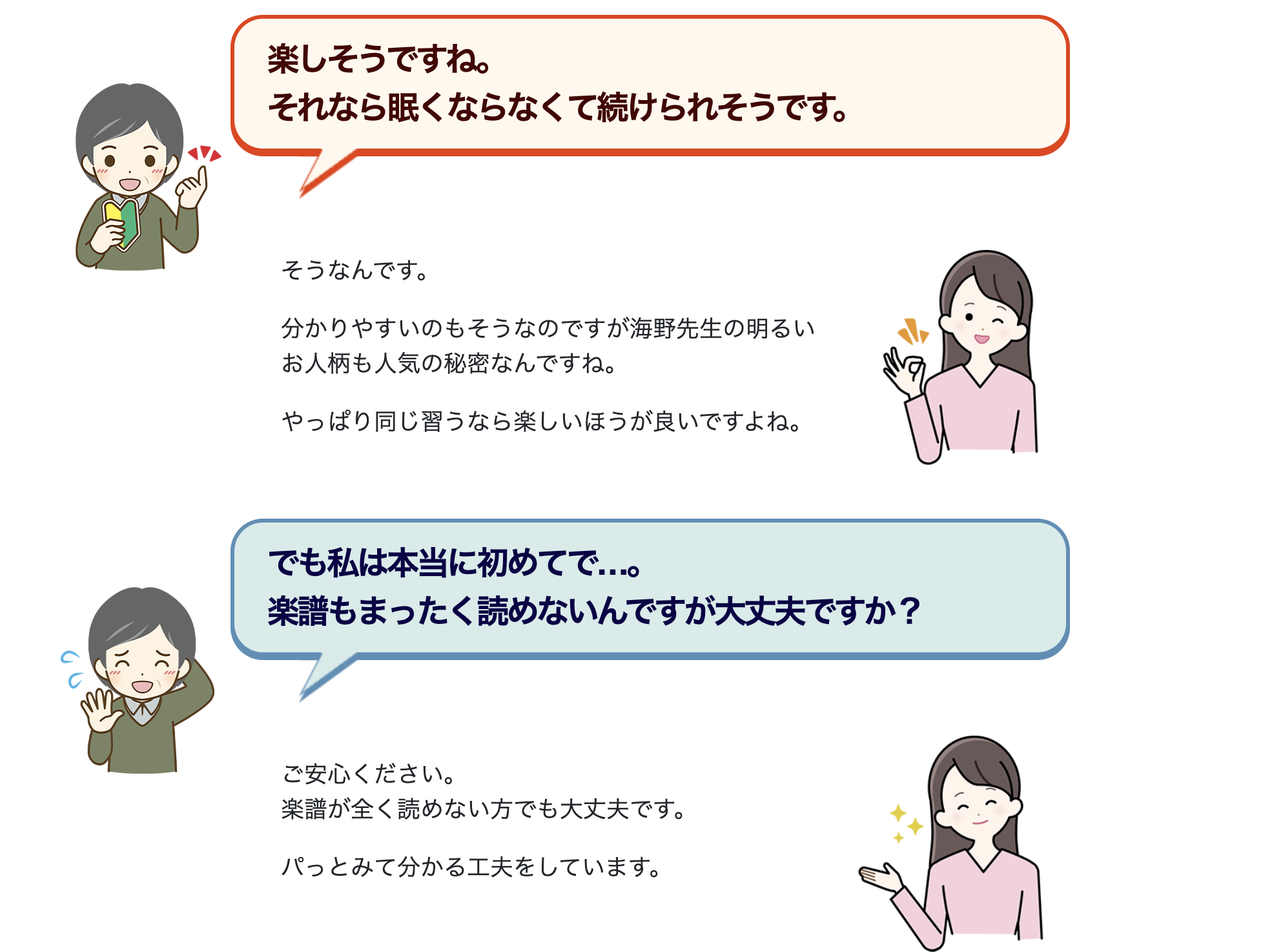 「独学で続けられるか」「教材の内容が難しすぎないか」といった不安には、無料体験で確かめること、短時間から始めて習慣化すること、録画で成長を可視化することを提案します。