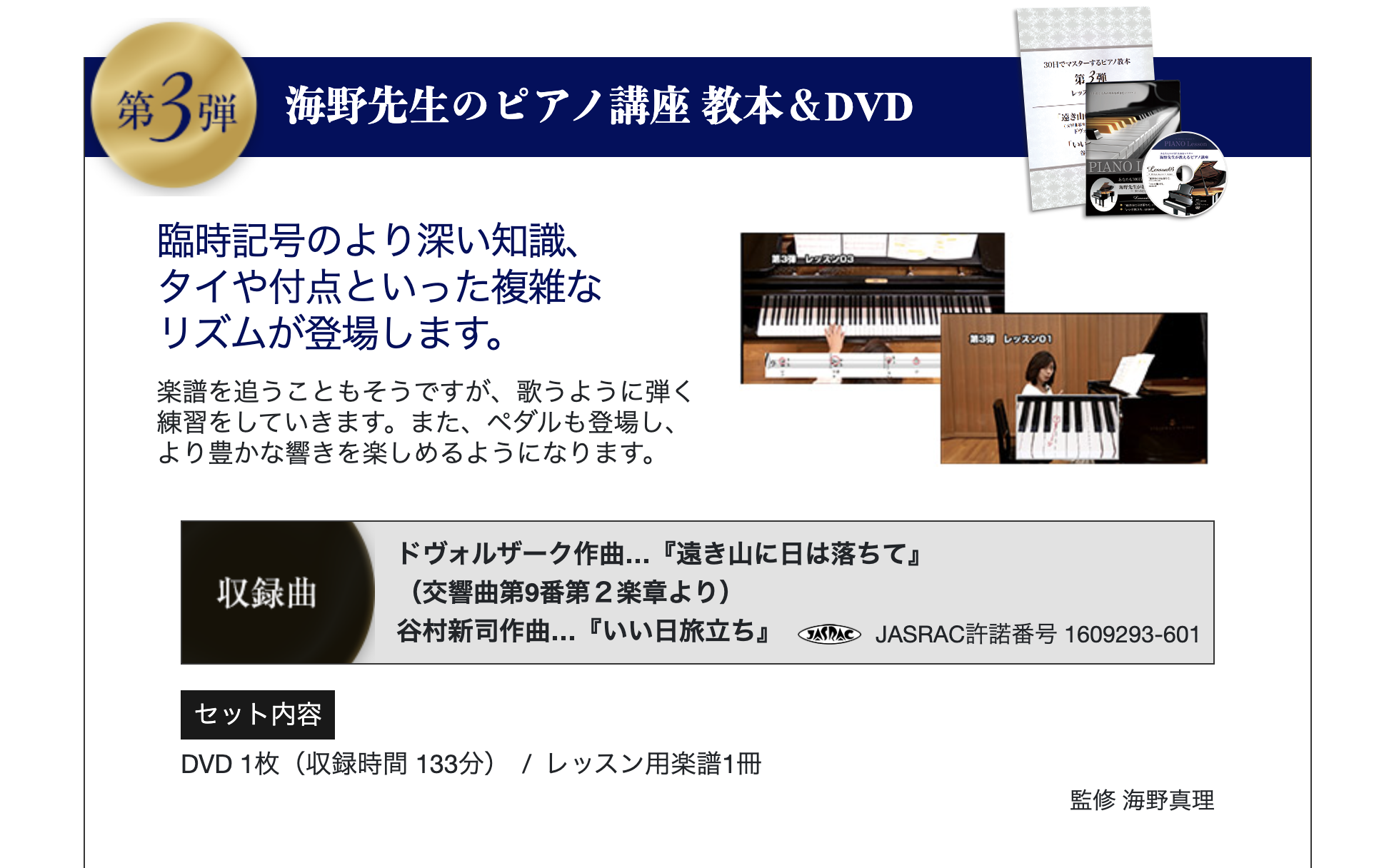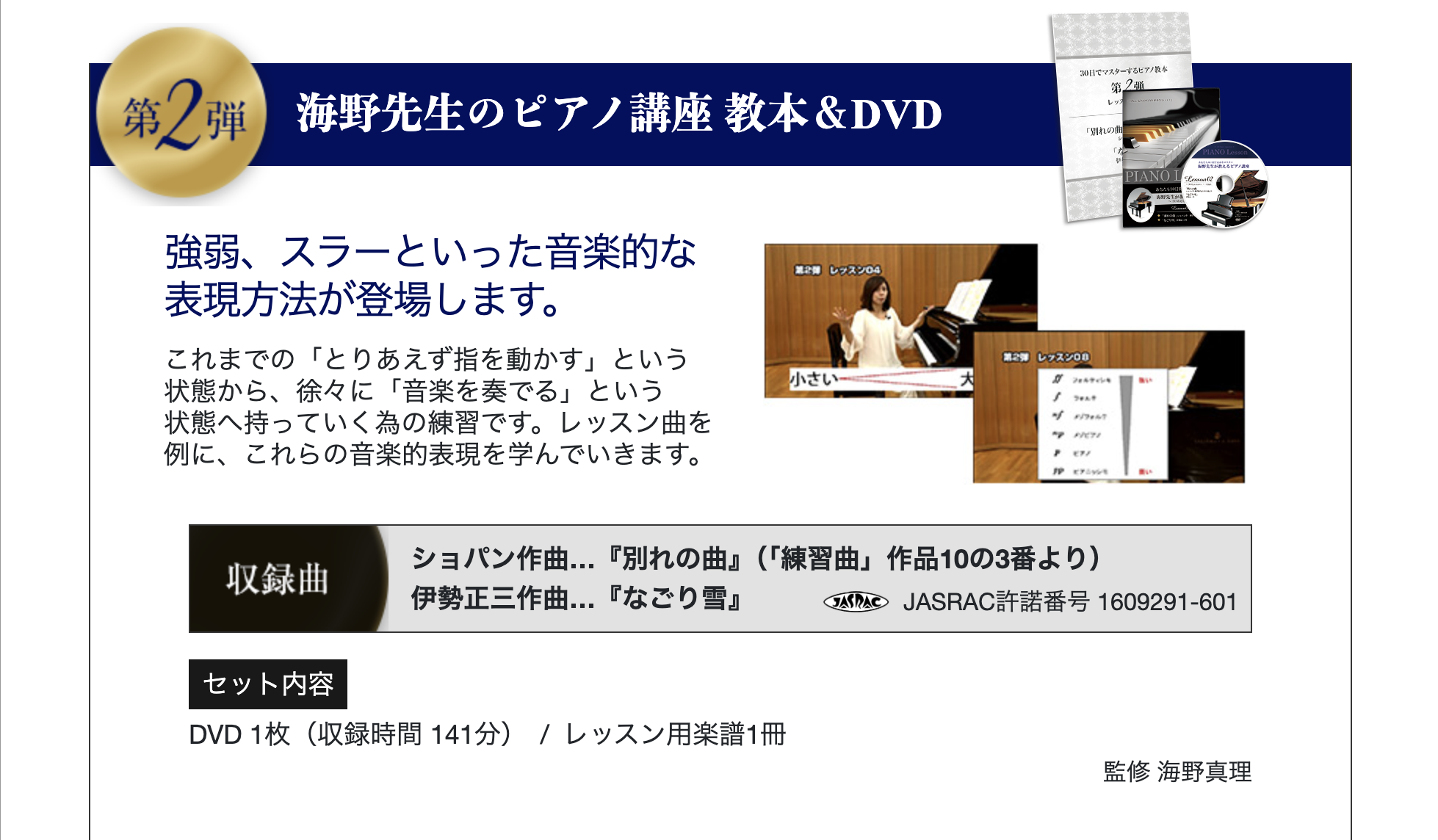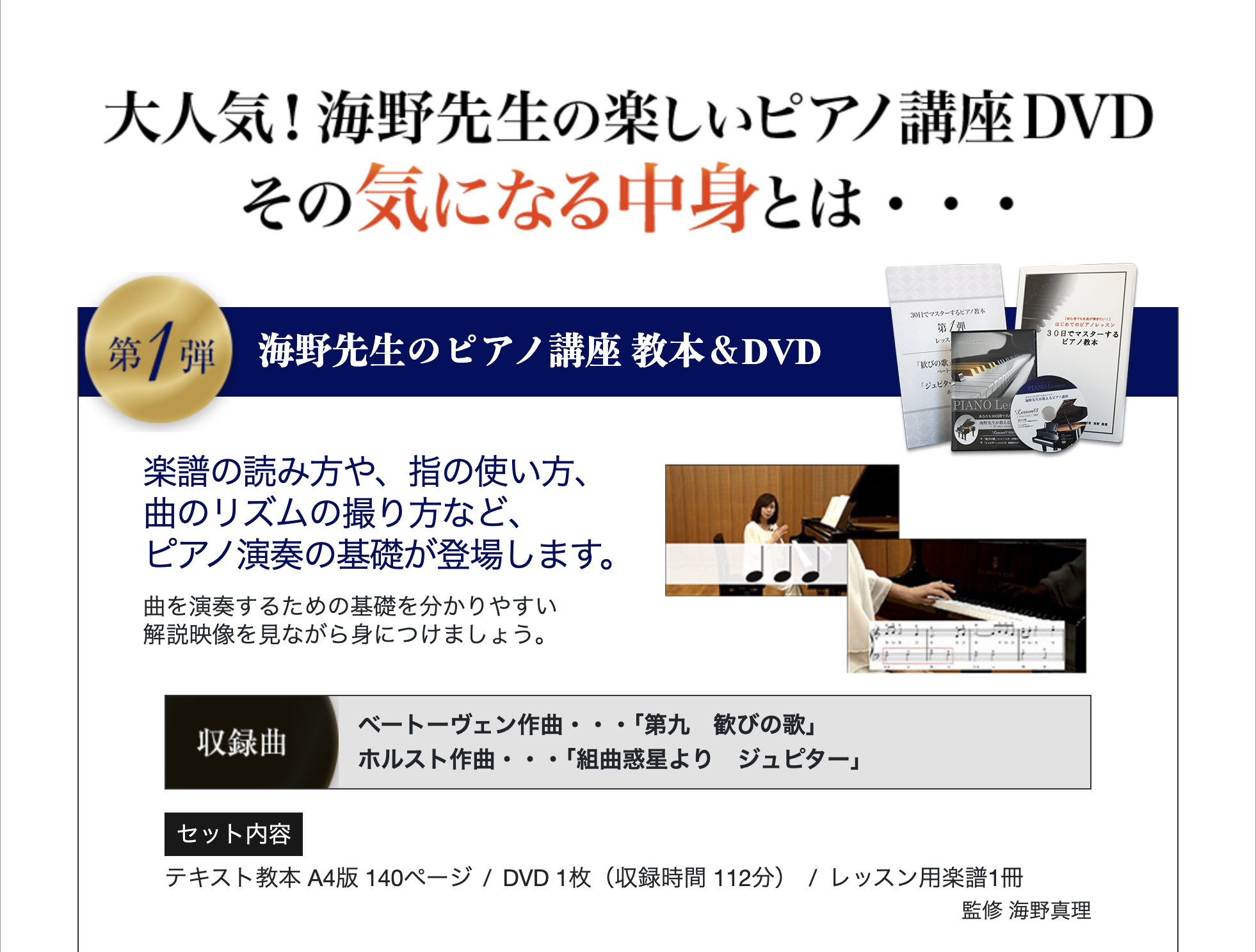 教材はテキスト(楽譜付き解説)、映像レッスン(DVDまたはストリーミング)、練習用楽曲集、補助資料(指番号表や練習チェックシート)で構成されます。